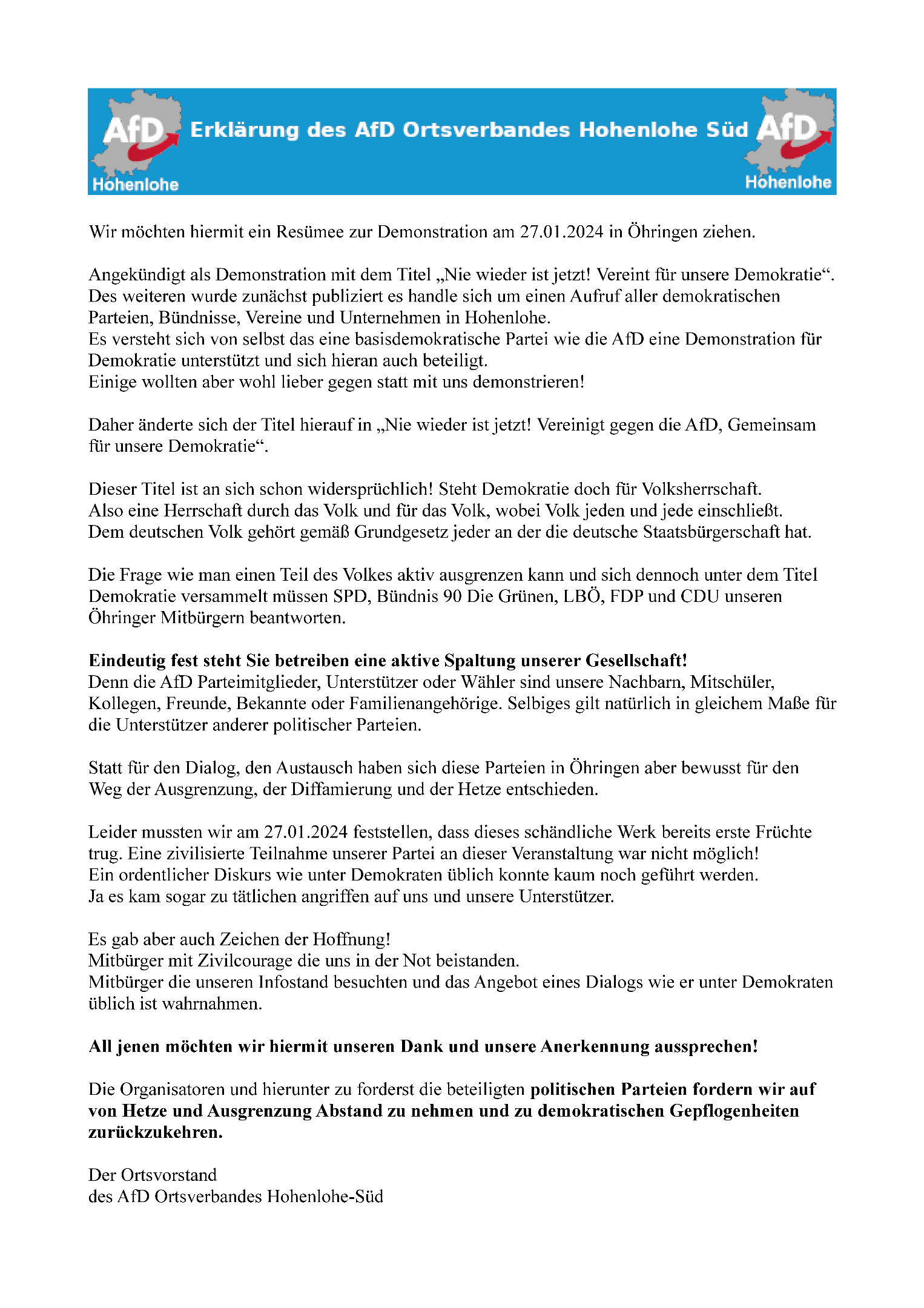 Hohenlohe Süd zur Demonstration am 27.01.2024 in Öhringen